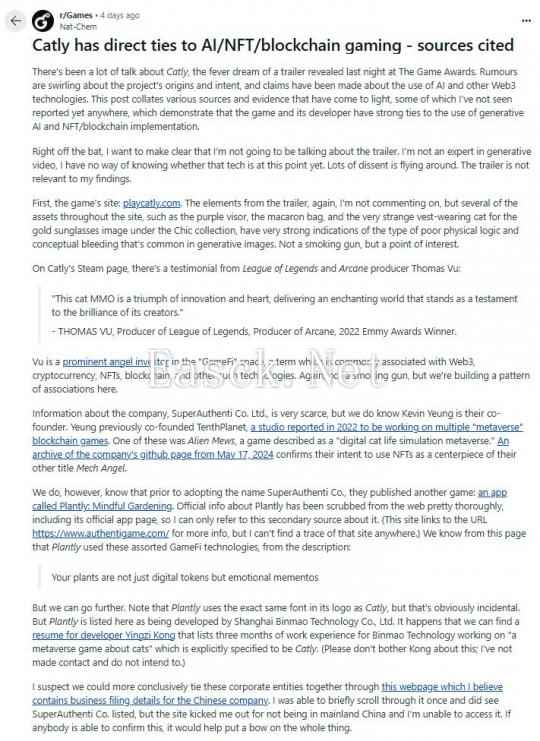 但很快也有玩家提出了质疑,认为这款即将2025年发布于Steam、Nintendo Switch和Apple Watch平台上的游戏,使用了生成式人工智能。 有名为“Nat-Chem”的reddit用户发帖质疑《Catly》的开发商SuperAuthenti,收集并提供了一些相关的报道和被曝光的证据。