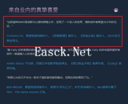 例如《Catly》的Steam页面简介引用了《英雄联盟》制作人THOMAS VU的评价,而VU是“GameFi”(该术语通常与Web3、加密货币、NFT、区块链和其他此类技术相关联)领域的著名天使投资人。
