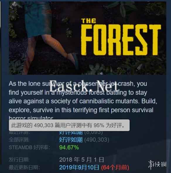 截稿之前,《森林》在Steam平台全部评测为“好评如潮”,490303条用户测评中,好评率高达95%。