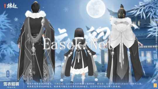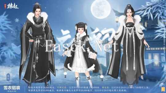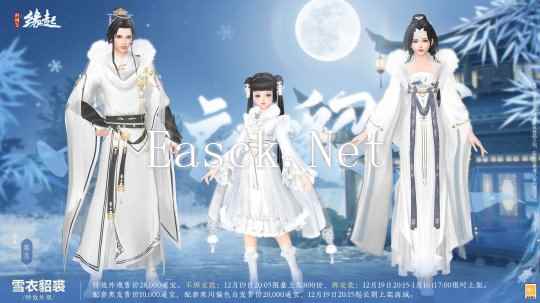【全新外装“雪衣貂裘”】 风摇金辔貂裘暖,雪满雕鞍玉勒寒。寒风凛冽,备衣御寒,特效外观「雪衣貂裘」为各位侠士迎风送暖。这次外装采用绸缎与皮草为主要面料,由江南纺织厂精工定制,修身剪裁,领口处的绒毛簇拥成团,金装玉饰更添玉雪仙姿。 成男款为长衫广袖,白纱披肩,保暖而不失雅韵;成女款则玲珑有致,罗衣轻扬,额间蝴蝶停驻,仿佛飘散着满袖芬芳。萝莉款下摆蓬松如云,袖口繁花绽放,胸前银蝶与蝴蝶结交相辉映,尽显可爱灵动之态! 外装共有四款偏色,男女款式各具特色,优雅端庄,尽显独特的江南风情。 ?售卖信息: 特效外观售价28,000通宝。不绑定款12月19 日20:05 限量上架800 份,绑定款12月19日20:15-1月16日7:00限时上架。配套黑发售价10,000通宝,配套寒川偏色白发售价20,000通宝,12月19日20:15起长期上架,享首周9折优惠。