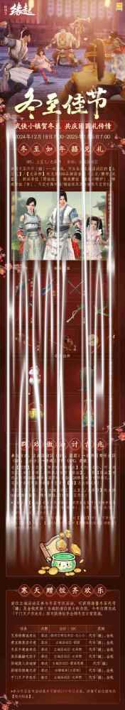 【冬至佳节,好礼上新】 岁末数九,大唐江湖瑞雪初降,主城活动区正在开展丰富的冬至庆典活动。12月19日7:00至1月6日7:00期间,侠士可携友品味民俗,共戏傲油,获取930品御厨套装、奇趣武器(新增苍云武器)、新品背挂「雪娃娃」、节日成就、26格大背包等节庆好礼!冬至如年,温情回馈,今年日常任务减负,仅需完成1个冬至日常任务,即可获得往年全部冬至日常任务奖励。