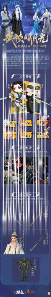 【武侠明月,唯在此时】 乱世百家齐争鸣,群侠沙场血染霜。《剑网3缘起》×《秦时明月》联动活动正式上线!过往的历史时隔多年依然在上演...先秦时的他们通过时空裂隙来到秦皇陵,一场全新的旅途,侠士快来加入吧! 12月19日7:00-1月23日7:00期间,完成活动任务,即可获得活动代币「墨榫」,轻松兑换活动奖励!更有10人秦皇陵限时彩蛋,等你前来探索!