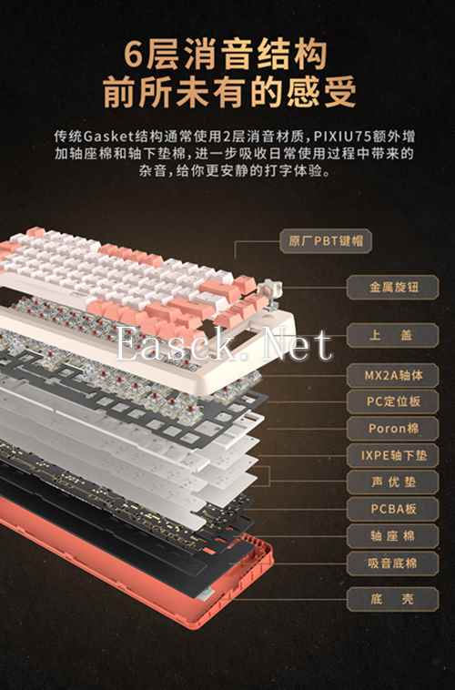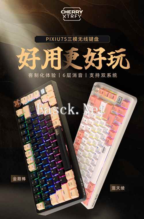 作为CHERRY全新客制化产品线的首款产品,PIXIU75首发推出两款配色,分别为金箍棒和混天凌,键帽采用高含量PBT材质,表面经过细致的磨砂处理,具备极强的耐用性和抗打油性,每次敲击,都带来独特的触觉享受与操作乐趣。
