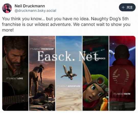 近日尼尔・德拉柯曼 (Neil Druckmann) 在 Blue Sky 发文称,该作将是顽皮狗最疯狂的冒险。尼尔表示:“你以为你知道...... 其实你根本不知道。顽皮狗的第五个系列游戏将是我们最疯狂的冒险,我们迫不及待地想给你们展示更多。”