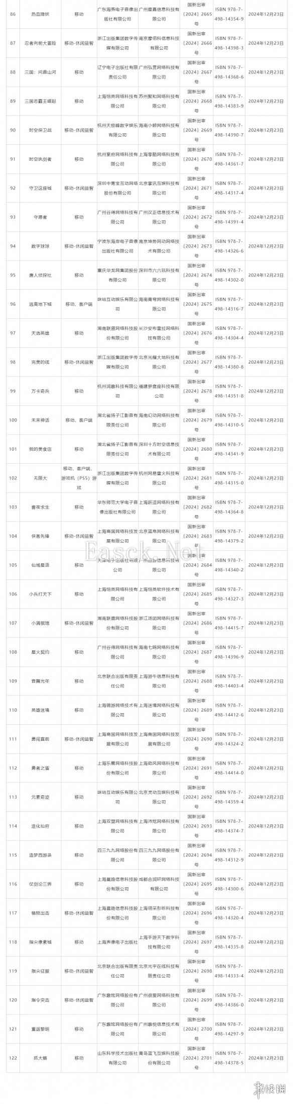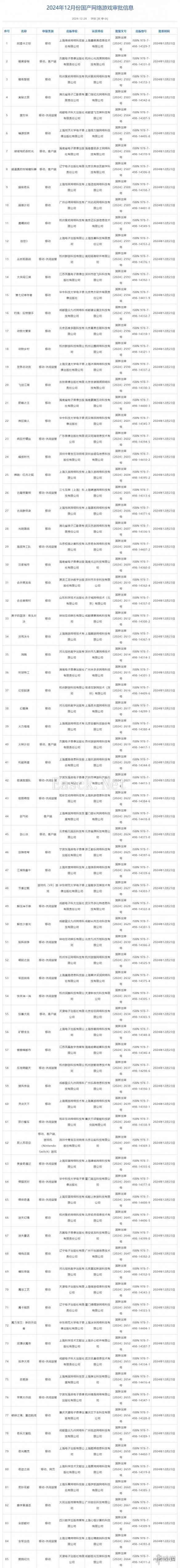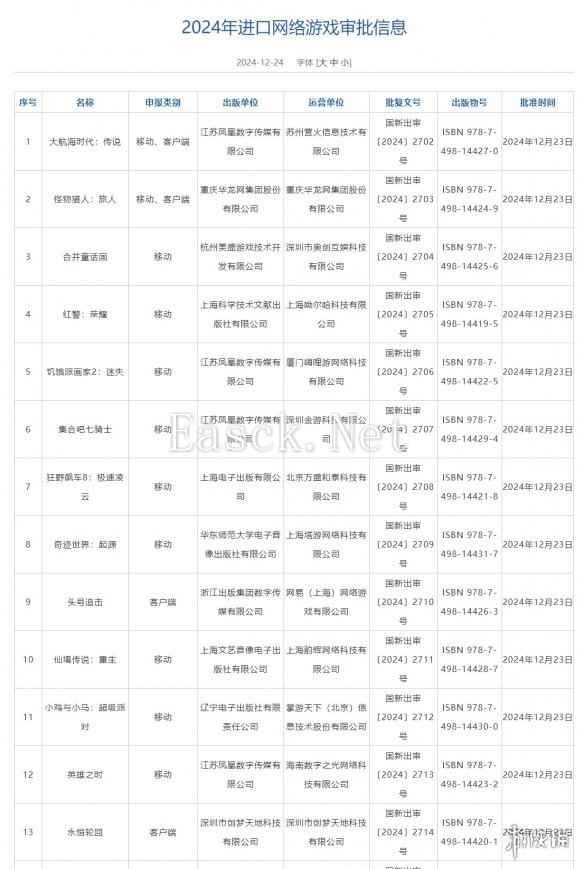 国家新闻出版署今天(12月24日)公布了12月国产网络游戏版号和第七批进口网络游戏版号,本次共有122款国产网络游戏获得版号、13款进口网络游戏过审,其中网易的《无限大》过审、《怪物猎人:旅人》过审。
