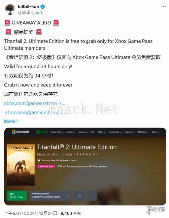 平安夜玩什么?XGPU会员可免费领《泰坦陨落2终极版》