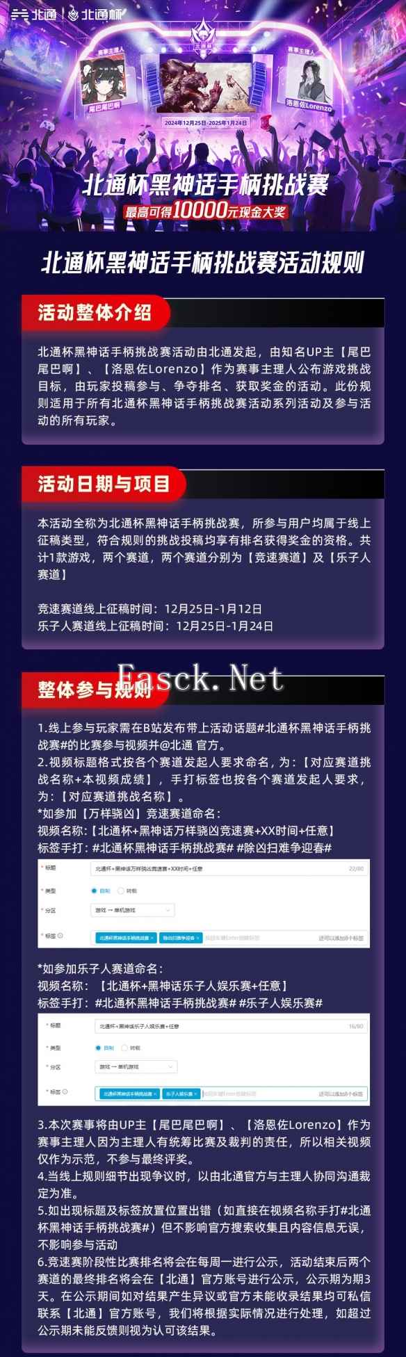 ●评定标准:完成挑战用时短者胜出,以关卡结算界面的用时为准。 ●赛事奖励:第1名10000元+限定礼盒,第2名5000元+限定礼盒,第3名3000元+限定礼盒,4-10名1000元+限定礼盒,11-20名北通鲲鹏40智控游戏手柄(巳蛇限定) 02 乐子人赛道●活动时间:12月25日至1月24日 ●参加方式: 1、录制使用北通手柄玩黑神话的视频,内容为完成【连战】【复战】模式下任意关卡,无限制,可使用MOD; 2、 将视频发布至B站,视频需遵循以下标题与标题格式,并@北通;