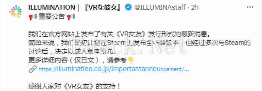 ILLUMINATION(副社长为I社前制作人)官方宣布,经过多次讨论后,他们放弃了在Steam上发布全年龄版本的新《VR女友》,而是决定以成人版本发布。 新《VR女友》预计将于2025年2月发售,支持中文但Steam锁国区。 游戏介绍:第一次踏入你的房间,以你梦寐以求的方式登场!与夕阳樱一起体验现实般让人心跳加速的感觉!一起分享蛋糕,观影,沐浴,与樱酱一同度过更多快乐时光! |