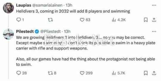 近日,《地狱潜者2》(Helldivers 2)首席创意官(CCO)就玩家们关心的八人合作模式进行了回应,并解释了目前该模式尚未开发的原因。 他指出:“我已经回答过几次了,目前不行。引擎、网络架构、UI、性能和难度都无法承受。我们需要进行大量的投资才能使八人合作模式正常运行。” 然而,未来仍然存在希望。Pilestedt透露,八人合作模式并非不可能。他表示,这是他们在Arrowhead工作室经常讨论的概念。CCO补充道:“未来会告诉我们将会发生什么。” 令人意外的是,玩家曾预测《地狱潜者3》将在2032年推出,届时将包含八人合作模式和游泳功能,而Pilestedt在某种程度上证实了这位玩家的预测。他表示:“我们正在将《地狱潜者2》发展成《地狱潜者3》……所以你可能是对的。除了游泳——我认为穿着厚重的防弹背心,拿着步枪和支援武器是不可能游泳的。而且,我们所有的游戏都有主角无法游泳的设定。” |