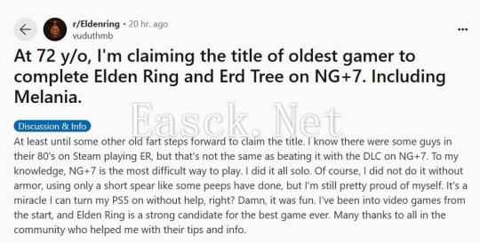 Reddit 用户 vuduthmb 声称自己是完成《艾尔登法环》本体和《黄金树之影》DLC 八周目难度的最年长玩家,这意味着需要总共通关八次游戏。他还开玩笑表示将一直卫冕这一这个头衔 “直到其他老家伙站出来挑战。” 实际上,《艾尔登法环》的多周目并不一定意味着会变难,但八周目确实相比一周目困难了许多。