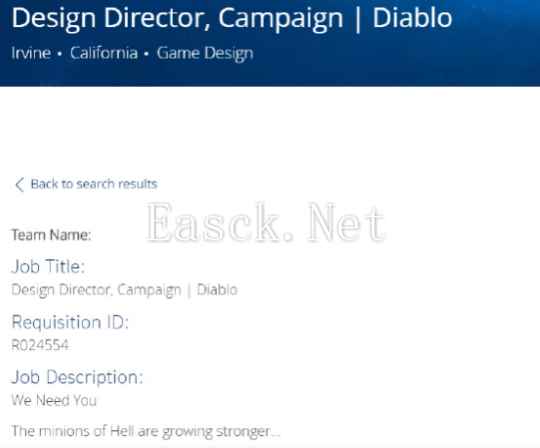 暴雪发布新的岗位招聘,暗示暗黑5正在制作中 近日,暴雪官网招聘放出了暗黑宇宙相关三个职位,分别是剧情设计总监,高级职业设计师和职业设计师。可诡异的是,这三个岗位既不从属于暗黑4开发团队,也不归于《暗黑:不朽》研发团队。