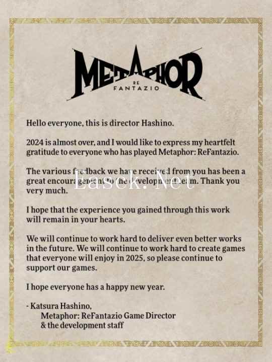 以下为桥野桂的感言全文: “大家好,我是总监桥野桂。 2024年即将结束,我想向所有游玩过《暗喻幻想》的玩家表达我衷心的感谢。 我们收到的各种反馈对开发团队来说是巨大的鼓舞。非常感谢大家。 我希望大家通过这部作品获得的体验能够留在你们的心中。 我们将继续努力,在未来为大家带来更好的作品。我们也将继续努力制作大家在2025年能够享受的游戏,所以请继续支持我们的游戏。 祝大家新年快乐。 《暗喻幻想》游戏总监 桥野桂及开发团队敬上”