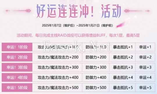 在2025年1月7日维护后至2025年1月21日维护前,“好运连连冲!活动”即将开启,英雄们每日每完成1次主线Raid战役可以获得可叠加的增益BUFF,最高可至5阶段!