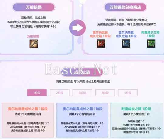 【福利活动】 在2024年12月31日维护后至2025年1月21日维护前,英雄们完成指定战役可以获得万能钥匙(每周可获得17个),同时,英雄们还可在万能钥匙兑换商店免费兑换指定道具,消耗万能钥匙就能开启这些道具兑换其中奖励!当英雄们集齐3个万能礼券后可以合成为“头衔:渴望成长的”。