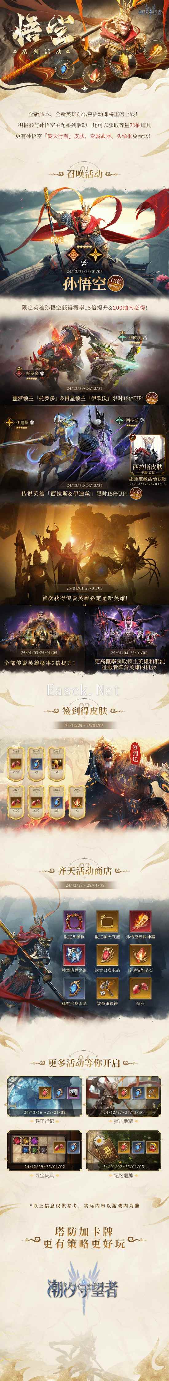 塔防加卡牌,更有策略更好玩! 《潮汐守望者》首个东方神话英雄「齐天大圣・孙悟空」及主题活动将在12月27日,全球同步上线! 中国文化世界瑰宝,童年记忆经典永存,安敢欺我华夏无神! 我们很荣幸获得了86版《西游记》总作曲许镜清老师的授权,将《云宫迅音》重新编配作为新英雄孙悟空的专属BGM ,一同带给热爱优秀传统文化的玩家们! 打碎天道解放众生: 此猴号曰孙悟空,有七十二般变化,得一铁棒唤作如意金箍棒,可大可小,挥舞之间,风雷震动。后封齐天大圣,性刚烈,斗天斗地,不惧诸神,曾搅乱凌霄,震动三界。 孙悟空在泰亚大陆上四处游历,以笑面示不屈,手持神兵,所追求的并非是虚无缥缈的神位,而是自由——包括泰亚在内,他要将世间众生从神明掌控下的虚假自由中彻底解放。 他仰望苍穹,心中涌起的不是敬畏,而是一种清晰明澈的使命感——打碎那所谓的天道,解放天地众生。 主题活动送皮肤拿神器 200抽必得悟空 孙悟空限定卡池「猴王现世」即将开启,签到更有孙悟空皮肤「焚天行者」免费送!积极参与活动,还有西拉斯皮肤、远古召唤水晶、传说技能晶石等重磅奖励奉上! 【累计签到送皮肤】 开启条件:通关战役N3-1 活动时间:2024年12月25日版本更新后 - 2025年01月05日23:59:59 活动说明:累计登录即可获得传说技能晶石、稀有召唤水晶等丰厚奖励,更有大奖孙悟空皮肤「焚天行者」免费送 【猴王现世召唤卡池限时开启】 活动时间:2024年12月27日00:00:00 - 2025年01月05日23:59:59 活动开启:通关普通战役N1-9 活动详情:在猴王现世活动期间,活动限定五星英雄孙悟空仅会出现在当前「猴王现世」限时活动卡池中。卡池召唤不同品质英雄的基础概率不变,孙悟空的召唤获取概率在卡池中提升15倍! *温馨提醒:若指挥官在200抽内获得的传说英雄并非孙悟空时,将会在第200抽时必获得该限定英雄! 【齐天活动送孙悟空专属神器】 活动说明:活动期间将开启「齐天」活动关卡,指挥官可以通过完成关卡战斗,完成活动任务来获得「蛟血玉」、「龙血玉」,在活动商店中兑换活动奖励 开启条件:注册4天及以上 & 通关关卡4-1 开启时间:2024年12月27日00:00:00 ~ 2025年1月5日23:59:59 可兑换时间:2024年12月27日00:00:00 ~ 2025年1月6日23:59:59 活动奖励介绍: 神话级神器:如意金箍棒(“英雄:孙悟空”专属神话级神器) 限定奖励:活动限定聊天气泡、活动限定头像框 其他奖励:装备重铸锤、碎片:远古召唤水晶、传说技能晶石、五星通灵体、稀有召唤水晶、大型体力药水、金币等 准备好迎接这场史诗战役了吗? 12月27日,《潮汐守望者》邀你一起,和大圣一起迎战强敌、击碎枷锁! 点击下载>>>游戏开启塔防之旅! |