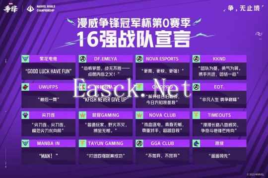 【漫威争锋冠军杯16强战队名单出炉】 今日,漫威争锋冠军杯16强战队名单出炉。1月3日-1月5日,这16支精英战队将再次踏上征程,向着冠军的宝座发起最后的冲击。他们将在接下来的三天里,展开更加激烈、更加残酷的角逐。究竟谁能在这场激烈的竞争中笑到最后,捧起那象征着至高荣誉的冠军奖杯,各位玩家可以拭目以待!