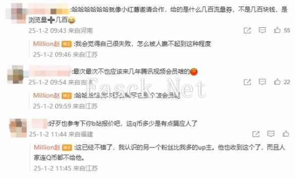 据悉,“Million赵”在B站的粉丝数量为10万左右,在评论区里,有网友说道:“好歹也参考下你B站报价吧,这Q币多少是有点膈应人了。”“Million赵”则称另外一位UP主也收到了这样的合作信息,但腾讯方连Q币都不给他。