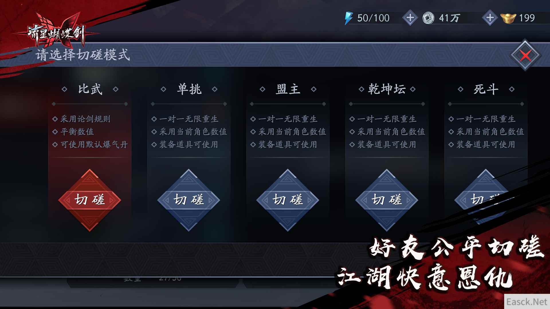 掌握好专属绝学【步月回风·灵】的使用时机,可以通过续接追击技能,扭转攻守之势,搭配长于连击的拳套武器,运用易武组合,可以在扳回局势后进行长时间的输出。 【好友切磋 快意江湖】 本次主播论剑争霸赛充分运用了《流星蝴蝶剑》手游中的好友自定义切磋系统。玩家可以通过邀请好友切磋,选择进入平衡数值的“比武”模式。该模式下,对战双方的基础属性将被平衡,可以使用默认爆气丹,采用论剑规则定胜负,在增强了战斗趣味性的同时也保障好友切磋的公平性。