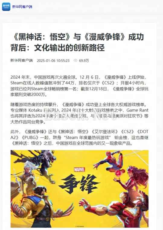 近日,由漫威IP正版授权、网易自研的PVP超级英雄射击端游《漫威争锋》受到了中国最具影响力网媒“新华网”的特别报道,称赞其“引领着中国游戏出海进入了一个全新的发展阶段”;同时“冠军杯”决赛最新赛果已出炉,让我们一起看看冠军花落谁家! 【新华网称赞《漫威争锋》“引领着中国游戏出海进入了一个全新的发展阶段”】 近日,《漫威争锋》受到了中国最具影响力网媒“新华网”的特别报道,《<黑神话:悟空>与<漫威争锋>成功背后:文化输出的创新路径》正文中提到:《漫威争锋》选择 “反向文化输出”,从IP角度来看,漫威宇宙超级英雄这一欧美 IP 在全球范围内拥有庞大的粉丝群体,影响力堪称欧美文化中的“西游记”。 通过网易中国研发团队的精细打磨和精准本土化适配,深入挖掘了全球玩家的兴趣点和情感诉求,成功吸引了众多玩家。《漫威争锋》的成功,不仅打破欧美在 PVP 射击游戏领域的长期垄断局面,其创新性的英雄连携机制以及场景破坏玩法,极大地丰富了游戏的对战乐趣和策略深度,玩家们也深刻体会到中国游戏团队的匠心独运和精湛研发技艺。 通过这种精品游戏的反向文化输出模式,《漫威争锋》为国产游戏出海提供了极具价值的成功范例和创新思路,引领着中国游戏出海进入了一个全新的发展阶段,为后续游戏的国际化拓展指明了方向。