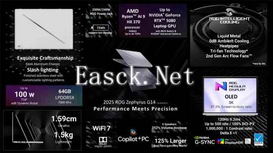 ROG 幻 14 配备最高 AMD Ryzen AI 9 HX 370 APU 和 RTX 5080 笔记本电脑 GPU,相比上一代的 Ryzen 9 8945 HS 和 RTX 4070 性能有所提升。 新机配有 64GB LPDDR5X-7500 内存和最高 2TB 存储空间,采用了第二代 Arc Flow 风扇、液金和热管散热组合。