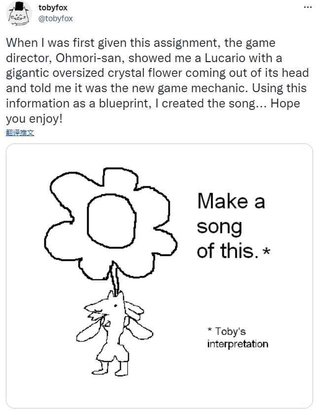 有趣的是,当《宝可梦:朱/紫》游戏总监给予Toby Fox任务时,总监给他看了一张头顶着巨大水晶花朵的路卡利欧照片,并告诉他这是“新的游戏机制”。Toby Fox使用这些信息作为蓝图,创作了“太晶团体战”的音乐。
