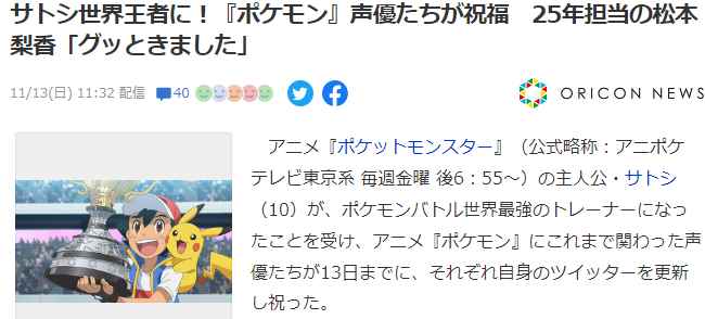 •在我们的光棍节这个特殊日子里,估计忙于哀叹的单身狗们正在蜂拥网购之时,那边的不老小智在与号称无敌的绝对王者训练师•丹德对决中,艰辛的获得了胜利,拿到了小智短短人生中的首个世界冠军训练师奖杯,距离1997年动画开播以来时隔25年之久。 •宝可梦动画的多位角色声优纷纷表示祝贺,包括梶裕貴、悠木碧、浪川大輔等,而已经担任小智声优25年的松本梨香更是欣喜,好在小智能够不老,否则估计谁也遭不住这漫长的夺冠之路吧。