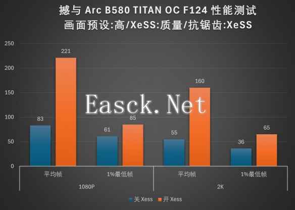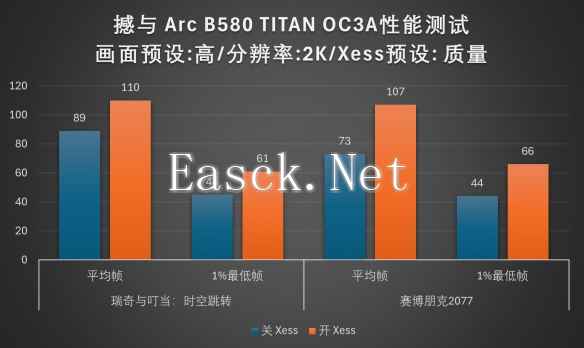 在当今的游戏硬件市场中,2K 分辨率显示器已占据主流地位,玩家们的视觉追求早已超越了传统的 1080P 分辨率。在这样的趋势下,撼与 Arc B580 TITAN OC 依旧展现出强劲实力。 以《瑞奇与叮当:时空跳转》为例,在 2K 分辨率下,开启 XeSS后,游戏平均帧数可达110帧,而 1% LOW 帧也稳定在 61帧,流畅游玩也依旧没有问题。而在《赛博朋克:2077》这款对显卡性能要求颇高的游戏中,开启 XeSS 前,平均帧数也有流畅的 73 帧,开启XeSS后则飙升至 107 帧,整整提升了 34 帧;1% LOW 帧也从 44 帧提升至 66 帧,足足提高了 22 帧。让玩家在游玩过程中,无论是穿梭繁华的都市,还是爆发激烈的战斗,都能享受丝滑游戏体验,沉浸感直接拉满!