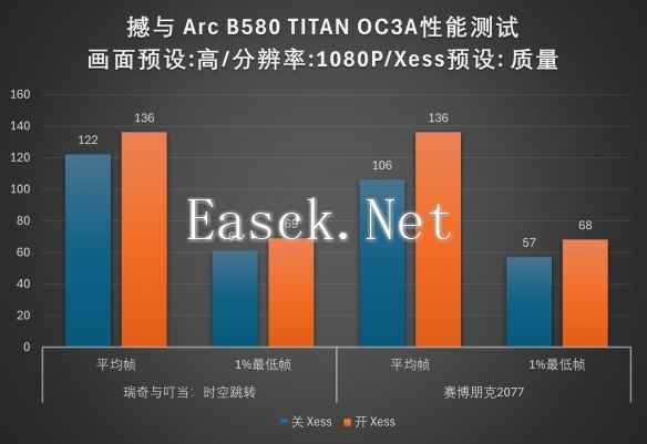 尽管 XeSS 游戏阵营起步相对较晚,但历经两年的技术沉淀与持续迭代,如今已成功覆盖众多 3A 游戏大作,《瑞奇与叮当:时空跳转》便是其中的典型代表,在 1080P、高画质预设下,游戏的平均帧率可达 122 帧。在开启 XeSS后,平均帧率显著提升至 136 帧,同时1%Low帧提升到了69帧的流畅水平。这一提升能够确保玩家无论是在快速移动、场景切换还是激烈战斗中,都不会出现明显卡顿、掉帧的情况,极大提升游戏沉浸感 。 而撼与 Arc B580 TITAN OC在《赛博朋克:2077》中的表现更加优秀,可以看到即使是没有开启XeSS,平均帧数已经来到了106帧,57的1%LOW帧表现足够王玩家流畅的在城市的大街小巷穿梭,而在开启XeSS后,137平均帧和68的1%LOW帧则让玩家的游戏体验更上一层楼,堪称出色!