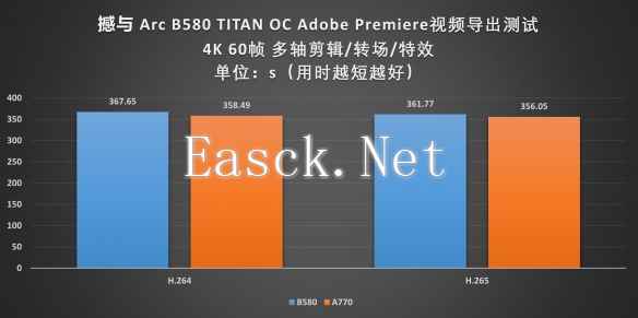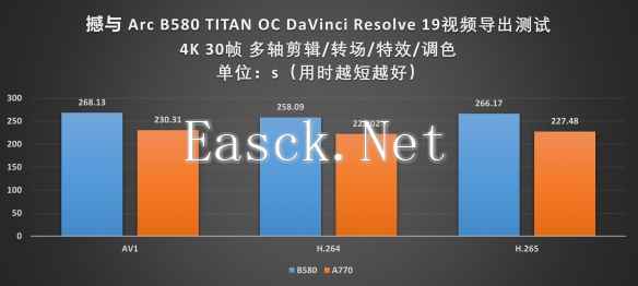 为了更加贴近用户日常的使用场景,我们并未选择纯视频导出测试,与之相反我们为每段导出的素材加入了诸如:多段预览轴、转场、特效合成以及调色选项。而从结果中我们可以看出,剪映在3种编码下的导出速度均超越了上一代的A770,相比之下节省了47%-62%的时间,可谓是十分强劲。而反观DaVinci Resolve 19与Adobe Premiere,虽然未能实现视频渲染速度的超越但也相距甚微,整体差距最高也仅有17%左右,况且这还是与上一代的顶级显卡来做对比,即使未能胜出,但也足矣称得上虽败犹荣。同时这让我也不禁开始期待未来即将发布的Arc B770和Arc B750以及它们的性能表现。