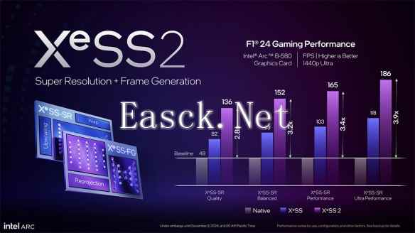 上文提到,搭载全新Xe2-HPG架构的撼与 Arc B580 TITAN OC还支持新一代的XeSS 2图形技术。而FI 24作为第一款支持XeSS 2的游戏,在各项画面优化上自然也是当仁不让,从上述对比图中可以看出, XeSS 2相比XeSS,不仅大幅降低了模糊感,同时细节保留也十分到位,极大程度减少了游戏内建模的图形错位,进步飞速。