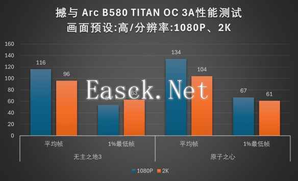 另外我们还测试了《无主之地3》和《原子之心》这两款没有XeSS技术加持的游戏,从测试数据中我们可以看出,无论是在1080P分辨率还是2K分辨率下,这张显卡都能为玩家提供百帧左右的游戏帧数水平,毫无疑问,即使是不依赖任何超分辨率与帧生成技术,玩家依旧可以使用这张撼与Arc B580 TITAN OC显卡流畅体验大部分3A游戏大作。
