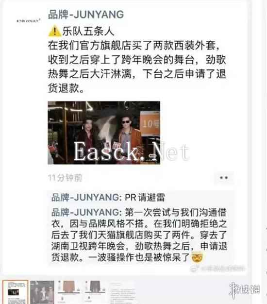 1 月 7 日,有网友发帖爆料称,五条人乐队通过其品牌旗舰店网购了两款西装外套,在收到衣服后穿着登上了某卫视跨年晚会的舞台,一番劲歌热舞后大汗淋漓,下台之后竟申请了退货退款。 该网友进一步指出,起初对方曾尝试与店方沟通借衣服,但因与品牌风格不符,遭到店方明确拒绝,随后对方便去网店购买了这两件衣服,用于跨年晚会表演,表演结束后便申请退货退款。与此同时,还有网友晒出了乐队两名成员在晚会上的表演画面以及那两件衣服的照片,据悉分别为一件女式大衣和一件女式西装。