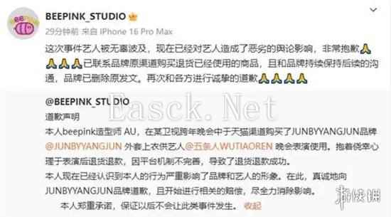 不过,就在 1 月 7 日傍晚,乐队造型师 @BEEPINK_STUDIO 发布微博主动致歉。其表示:“本人 beepink 造型师 AU,在某卫视跨年晚会中通过天猫渠道购买了 JUNBYYANGJUN 品牌 @JUNBYYANGJUN 外套上衣,以供艺人 @五条人 WUTIAOREN 晚会表演使用。当时抱着侥幸心理,在表演后进行了退货退款操作。”