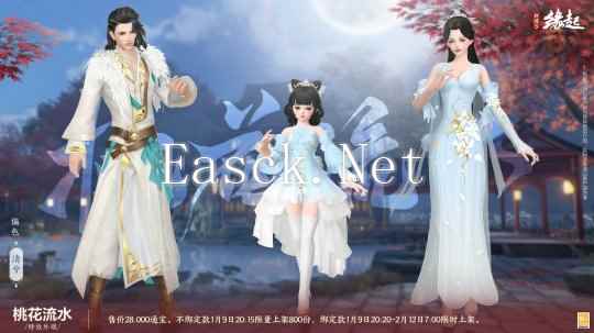 全新特效外观「桃花流水」 灼灼桃花艳,映水漾晴波。全新特效外观「桃花流水」翩然登场。 「桃花流水」套装拥有蓝色和粉色两种配色,搭配柔软且极具层次感的材质,特效流光溢彩如诗如画,仿佛将儿时的美梦具现于眼前。 成男款则采用少见的窄袖设计,金白配色清新亮眼,领口的独特结合赋予外装一丝贵公子的儒雅气度;成女款优雅华贵,简洁流畅的线条勾勒出迷人轮廓,温柔中带有高贵气质;萝莉款则充满灵动可爱之感,层叠裙摆增添活泼气息,恍若林间仙子翩翩降临。 售卖信息 售价28,000通宝。 不绑定款1月9日20:15限量上架800份, 绑定款1月9日20:20-2月12日7:00限时上架。