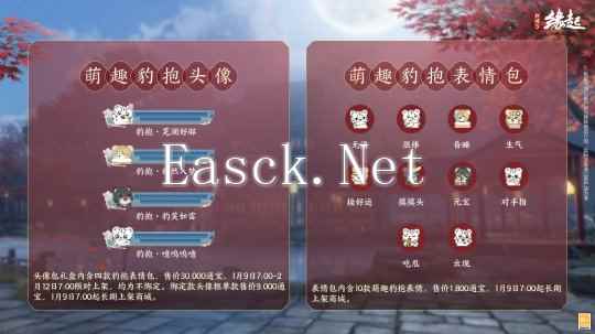 此外,另有四款“豹抱”同款头像框与萌趣表情包同步上线! 售卖信息 萌趣豹抱头像礼盒售价30,000通宝, 内含4款豹抱头像框,均为不绑定款, 1月9日7:00-2月12日7:00限时上架。 绑定款头像框单款售价9,000通宝, 1月9日7:00起长期上架商城。 萌趣豹抱表情包售价1,800通宝, 内含10款萌趣豹抱表情, 1月9日7:00起长期上架商城。