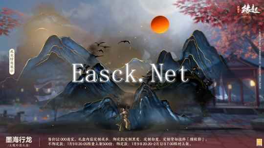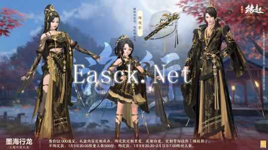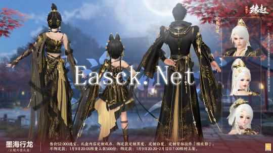 全新原创主题外装礼盒「墨海行龙」 墨色藏龙隐,金辉耀华裳,全新原创主题外装礼盒「墨海行龙」以山水墨色为主题,勾勒墨海间游走的行龙,磅礴大气。 暮色四合,如浓墨重彩泼于绢帛之上。成男款衣着豪迈大气,一身玄色劲装,绣以金龙腾云图案,威风凛凛。宽袍大袖,颇具盛唐气概,领口处饰以毛绒,更显其英武之气。成女款裙裾摇曳,如同盛开的墨莲,金线勾勒的山水云纹在其上蜿蜒,流光溢彩。肩披轻纱,如雾气般笼罩,又轻薄如蝉翼,盈盈欲坠。萝莉款裙摆轻盈,翩跹如蝶翼,似有暗香浮动。腰间以束带紧拢,更显其娉婷身姿。 售卖信息 礼盒内含定制成衣、绑定款定制黑发、定制白发、定制背部挂件「缠枝影」,售价52,000通宝; 不绑定款:1月9日20:05限量上架500份; 绑定款:1月9日20:20-2月12日7:00限时上架。
