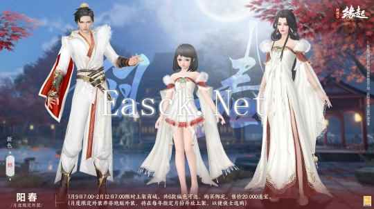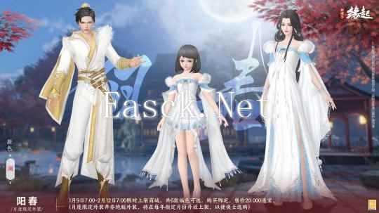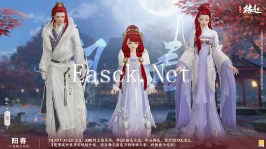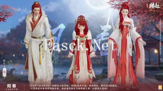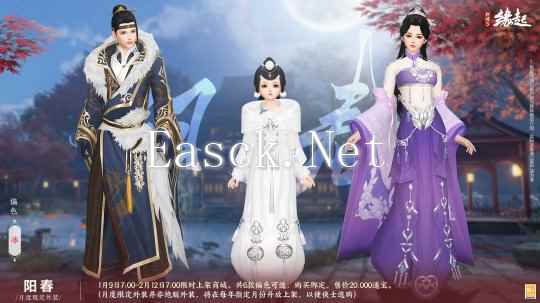 月度限定外装「阳春」 蛇年迎新,齐换华裳。月度限定外装「阳春」即将上线!全新偏色「阳春·烬」与「阳春·澜」温暖上架,4款经典偏色同步返场! 成男款以金银点缀,斜襟设计搭配绒毛披肩,温暖潇洒;成女款上衣贴身轻盈,袖口环绒,胸前垂链与流苏装饰,优雅大方;萝莉款短裙缀以银球,新年增趣,红裙喜庆紫裙典雅,白绒镶玉,吉祥美好。 售卖信息 售价20,000通宝,可使用新春专属折扣券。 1月9日7:00-2月12日7:00限时上架商城,共6款偏色可选,购买绑定。