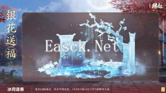 全新烟花「冰荷逢春」 全新烟花「冰荷逢春」上线,春气拂槛花归晚,胧夜吹灯冰屑阑。寒冬景象中特有的冰雕玉荷,借以恭贺新春! 售卖信息 售价2,800通宝。 1月9日7:00-2月17日7:00限时上架商城,均为不绑定款。