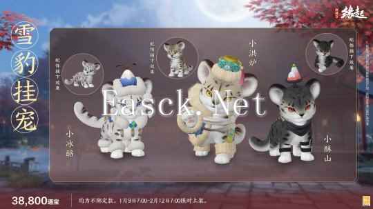 萌趣“豹抱”系列新品 风雪之间,三只幼豹萌动现世,为江湖增添一抹趣味生机!全新“豹抱”系列挂宠各有特色:“小冰酪”活泼机灵,总爱四处撒欢;“小洪炉”慵懒随性,最爱窝着打盹;“小酥山”聪颖狡黠,藏着许多小心机。雪豹幼崽憨态可掬,娇小可爱,既有趣又治愈,陪伴你闯荡江湖,为你的江湖之旅增添无限欢乐与温暖。 售卖信息 售价38,800通宝,均为不绑定款。 1月9日7:00-2月12日7:00限时上架。