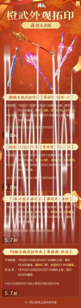 大小橙武拓印券 古剑寒黯黯,铸来几千秋。《剑网3缘起》大小橙武外观拓印铸摹图惊喜来袭! 80级大橙武拓印券「摹铸图·稀世·二」、80小橙武拓印券「摹铸图·珍品·二」限时特惠4.8折,70级大橙武拓印券「摹铸图·稀世」、70小橙武拓印券「摹铸图·珍品」享限时5.7折惊喜返场! 侠士获得铸摹图后,选中并对相应神兵使用即可生成无属性的同款特效外观武器,使用对应收集道具后即可在商城中进行拓印,拓印仅需花费100通宝。需要拓印心仪神兵使其常伴于身的诸位侠士千万不要错过! 售卖信息 80级大橙武拓印券「摹铸图·稀世·二」 不绑定款:1月9日7:00至1月16日7:00限时上架,原价68,800通宝,限时4.8折,折后价33,024通宝。 绑定款:1月16日7:00至2月12日7:00限时上架,售价68,800通宝。 80小橙武拓印券「摹铸图·珍品·二」 不绑定款:1月9日7:00至1月16日7:00限时上架,原价48,800通宝,限时4.8折,折后价23,424通宝。 绑定款:1月16日7:00至2月12日7:00限时上架,售价48,800通宝。 70级大橙武拓印券「摹铸图·稀世」 不绑定款:1月9日7:00至1月16日7:00限时上架,原价68,800通宝,限时5.7折,折后价39,216通宝。 绑定款:1月16日7:00至2月12日7:00限时上架,售价68,800通宝。 70小橙武拓印券「摹铸图·珍品」 不绑定款:1月9日7:00至1月16日7:00限时上架,原价48,800通宝,限时5.7折,折后价27,816通宝。 绑定款:1月16日7:00至2月12日7:00限时上架,售价48,800通宝。