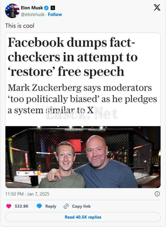 作为face book的竞争对手,X的老板马斯克(Elon Musk)对此表示“超酷”,因为他与川普关系不错(还担任新机构的重要职务),所以自然会对新盟友表示支持。 Meta全球事务长Joel Kaplan在官方博客中指出,Meta的事实核查系统日益复杂,尽管其中许多努力出发点是好的,但这个系统已经发展到“我们犯下太多错误”的地步,导致很多社交网络用户感到沮丧。