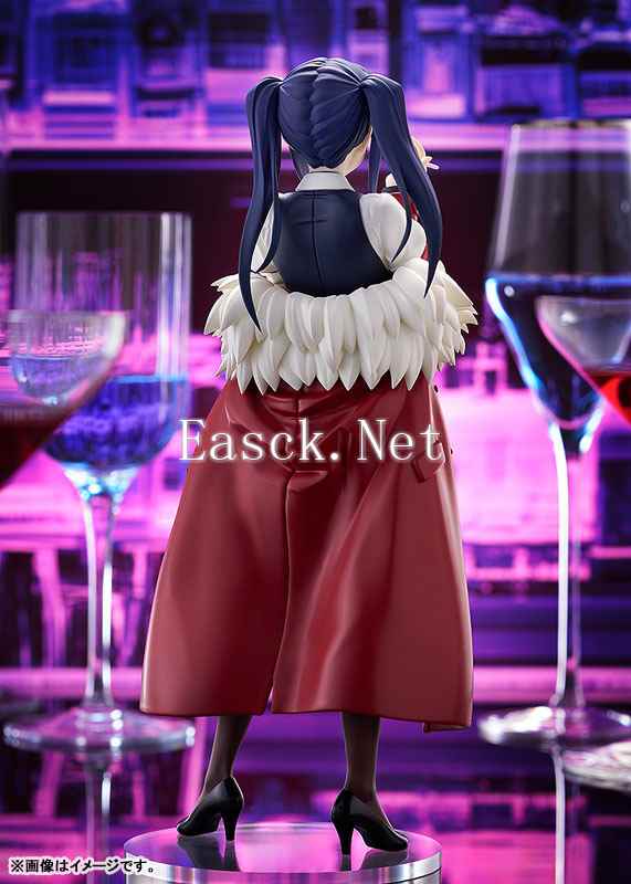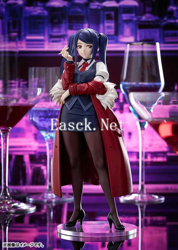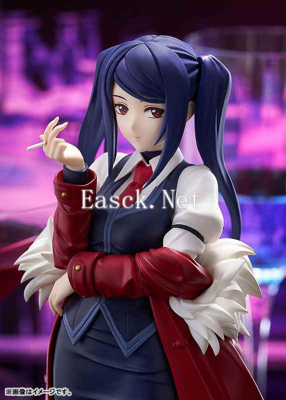 一头经典的黑色双马尾的酒保依旧穿着标准的黑色马甲与短裙,外面套着红色的大衣。短裙之下一双黑色的长袜搭配上黑色高跟鞋,紧贴肌肤的袜子勾勒出大腿与膝盖的轮廓。红色的领带与白衬衫、黑色马甲形成鲜明对比。左手托着右臂,右手上拿着香烟给人一种成熟又神秘的氛围。