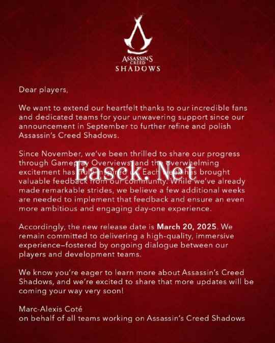 整个2024年,Steam平台共上架了1600多款国产游戏,较2023年提升约45%,Steam国区玩家2024年消费额估算在200亿元人民币左右。 《刺客信条:影》再度延期 今日一早,育碧宣布《刺客信条:影》再次延期。发布时间由原本的2月14日延期至3月20日发售。 育碧官方解释:“亲爱的玩家们,我们衷心感谢令人难以置信的粉丝和敬业的团队们,自从我们9月发布公告以来,你们一直坚定不移地支持我们进一步完善和打磨《刺客信条:影》。”