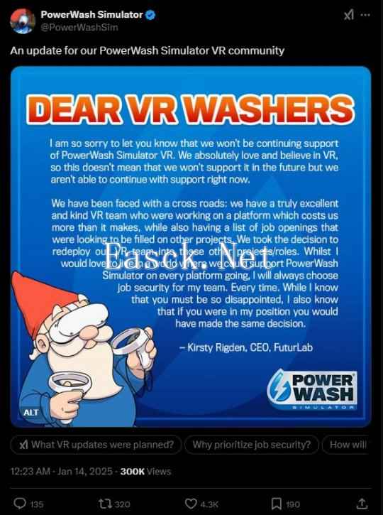 由FuturLab开发的解压模拟游戏《冲就完事模拟器》,在2023年推出了游戏的VR版本,受到了不少喜爱本作的玩家的好评。 ![]() 不过近日FuturLab官方发布声明,表示虽然团队“非常热爱并相信VR(设备或平台)”,但“目前无法继续(为VR版本)提供支持”。 对此FuturLab的首席执行官Kirsty Rigden说:“我们面临着一个十字路口:我们拥有一支非常优秀和善良的VR团队,他们正在开发一个成本高于收益的平台,同时还有一堆职位空缺需要其他项目来填补。” ![]() 因此FuturLab的VR团队现已重新部署到“其他项目/角色”上。Rigden总结道:“虽然我希望生活在一个可以在所有平台上支持《冲就完事模拟器》的世界里,但我会始终为我的团队选择工作保障。每一次。虽然我知道你一定非常失望,但我也知道,如果你处于我的位置,你也会做出同样的决定。” ![]() |
