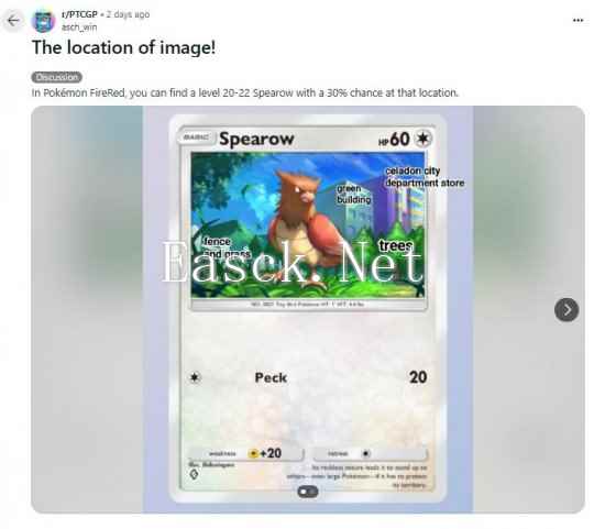 名为“asch_win?”的reddit用户,就明确指出了猎雀卡牌的插画取景位于《宝可梦 叶绿》玉虹市。而名为“jteede”的reddit用户发现了更多的对应,例如地鼠1星卡牌的位置就在枯叶市附加的山洞处;鬼斯通则在紫苑镇的宝可梦中心和宝可梦塔之间;嘟嘟则是在17号公路东侧的自行车道上。