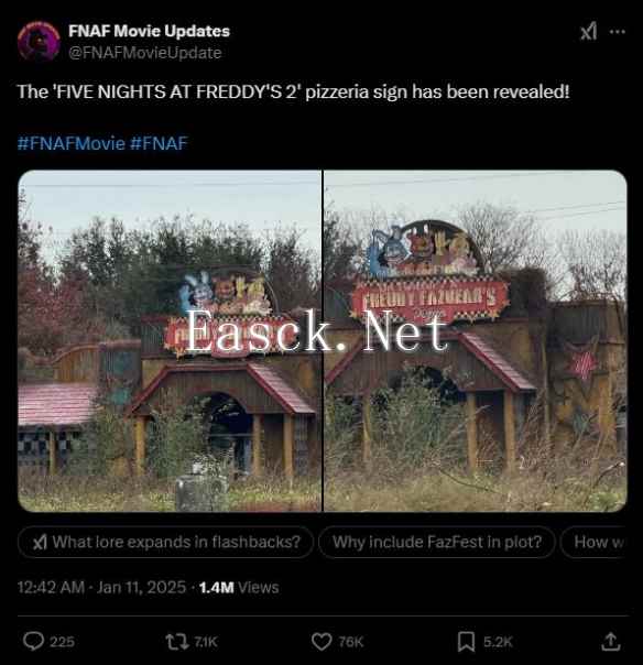 由环球影业携手布伦屋共同打造的《玩具熊的五夜后宫》电影版,灵感源自那款广受欢迎的同名恐怖游戏系列。 该片于2023年10月隆重上映,不仅在全球首映日便斩获了1.3亿美元的票房佳绩,最终全球总票房更是逼近3亿美元大关,赢得了观众与业界的一致好评,更一举成为布伦屋制片史上票房最高的电影里程碑。 紧接着,续集的制作计划迅速推进。主演乔什·哈切森透露,第二部将以经典角色弗雷迪为核心,规模更为宏大,恐怖氛围也将更为浓烈。布伦屋官方亦正式宣布,《玩具熊的五夜后宫2》将于2025年12月5日震撼登陆大银幕。 近日,推特账号“FNAF Movie Updates”爆料称,《玩具熊的五夜后宫2》的拍摄现场已搭建完成。从泄露的照片中,可以窥见影片的主要情节将围绕在“破败的弗雷迪·费兹贝尔披萨店”展开。尽管这一消息尚未得到官方证实,但据称这些照片拍摄于新奥尔良郊外河镇,为影迷们提前揭开了续集的神秘面纱。 |