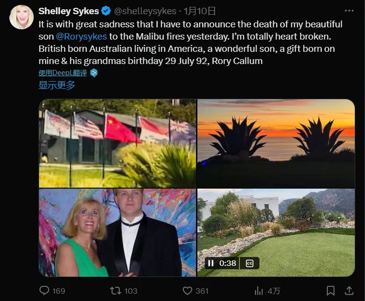 澳大利亚曾经的童星及励志演说家罗里·赛克斯(Rory Sykes)在洛杉矶的一场大火中不幸遇难。这场灾难性的大火吞噬了他们位于洛杉矶的豪华庄园。在生命的最后时刻,罗里强忍痛苦,告诉母亲谢莉不要顾及他,要尽快逃离火场以保全自己。 然而,面对这突如其来的灾难,谢莉女士不愿放弃对儿子的救援。她试图扑灭屋顶的火焰,但无奈消防管道内无水可用,最终只能眼睁睁地看着罗里因吸入有毒烟雾而窒息。事后,消防员向谢莉证实,罗里的死因是一氧化碳中毒。 这场大火不仅带走了罗里年轻的生命,也给他的家庭带来了无尽的悲痛和哀伤。 |