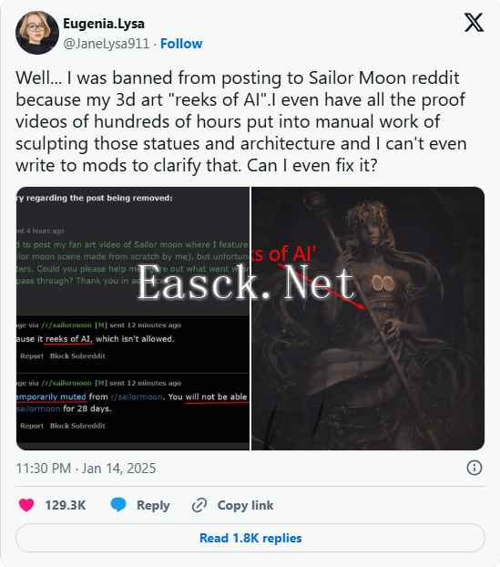 近两年来,AI技术发展迅猛,特别是在绘图和影像生成领域。不过,许多创作者对AI持强烈抵制态度,尤其是绘图圈内的人士认为,AI训练常常未经许可使用其他艺术家的作品作为素材,这侵犯了创作者的权益。部分讨论区和社群甚至直接禁止任何AI生成的作品,不论是否合法合规。 最近,一位3D场景美术师Eugenia Lysa分享了自己制作的黑暗幻想版《美少女战士》游戏视频,却被Reddit的管理员判定为AI生成作品,直接删除了她的帖子,并给她实施了永久封禁,连申诉的机会都没有。 Eugenia Lysa使用Unreal Engine 5制作了一段约5分钟的“黑暗幻想版《美少女战士》”游戏视频。视频风格类似于《黑暗灵魂》系列,但场景设计中融入了大量《美少女战士》的元素,比如雕像和物件都参考了原作,并附有详细的对比图。然而,当她把作品分享到Reddit的《美少女战士》讨论区后,却被管理员RockyCoon判定为AI生成作品,迅速删除了帖子。同时,Eugenia Lysa也被暂时禁言,无法联系管理员进行解释。 在试图沟通无效后,Eugenia Lysa前往管理员RockyCoon的Bluesky账号,希望能直接对话澄清。然而,她的尝试再次受阻,因为RockyCoon在未回应任何消息的情况下,直接封锁了她的账号。最让人震惊的是,当Eugenia Lysa表示愿意提供Unreal Engine 5的场景文件和视频作为证据来证明作品不是AI生成时,管理员并没有接受她的申诉,反而将她的Reddit账号从暂时禁言升级为永久封锁。 这一事件引发了广泛的网友愤怒,特别是在不久前发生的《鬼灭之刃》同人绘师被无端指控使用AI的事件之后,许多人对这种“未经查证就判定为AI”的做法感到不满。 很多人认为,Eugenia Lysa已经提出愿意提供证据,但却被无视并遭到永久封禁,实在让人难以理解。事件曝光后,网友们纷纷涌入讨论区,对RockyCoon的做法表示不满,有些甚至进行了人身攻击。对此,Eugenia Lysa呼吁大家不要进行骚扰或威胁,强调她希望的是理性沟通,而不是对立。 大约6小时后,RockyCoon发表声明对Eugenia Lysa表示了“道歉”。然而,他的声明引发了更多争议,因为其中提到:“只要我判定是AI的作品,这就是结论。我不接受任何证据或申诉,因为这些证据也可能是AI伪造的。”并强调审核是基于人工判断,而非仅依靠举报。 这一举动让许多网友认为,这根本不算道歉,而是为自己的行为辩解并进一步巩固权威。有评论指出:“这根本是在说,‘我们怀疑是AI,那它就是AI’,这不就是赤裸裸的霸凌吗?”“这公告毫无歉意,只是更强硬地表明管理员的审核标准不容质疑。”“连证据都不接受,这样的审核还有什么公正性可言?” |