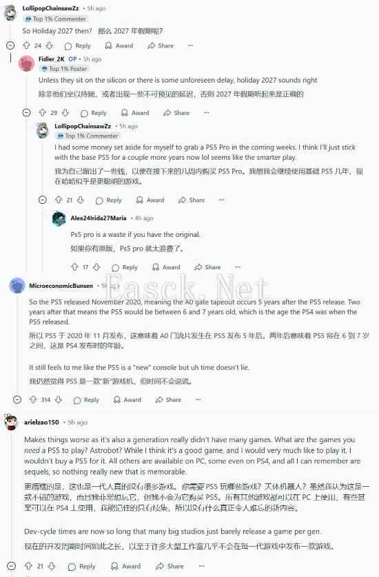 相关话题也在Reddit论坛上引发了热烈讨论,网友们纷纷发表了自己的看法: 有网友感叹时间流逝之快:“PS5于2020年11月发布,这意味着A0芯片流片发生在PS5发布五年后。再过两年意味着PS5的生命周期将达到6到7年,这与PS4发布时的周期相同。我仍然觉得PS5是一款“新”主机,但时间不会说谎。” 也有玩家提到了PS5的游戏阵容:“与PS4的游戏阵容相比,PS5似乎没有太多令人难忘的作品。这也是我仍然觉得PS5有点新的原因。仍在等待一款能与《战神》或《血源诅咒》相媲美的游戏。” 除了这些,还有玩家推测PS6可能会在2027年假日季发布:“除非他们囤积芯片或者出现一些无法预见的延误,否则2027年假日季听起来很有可能。”