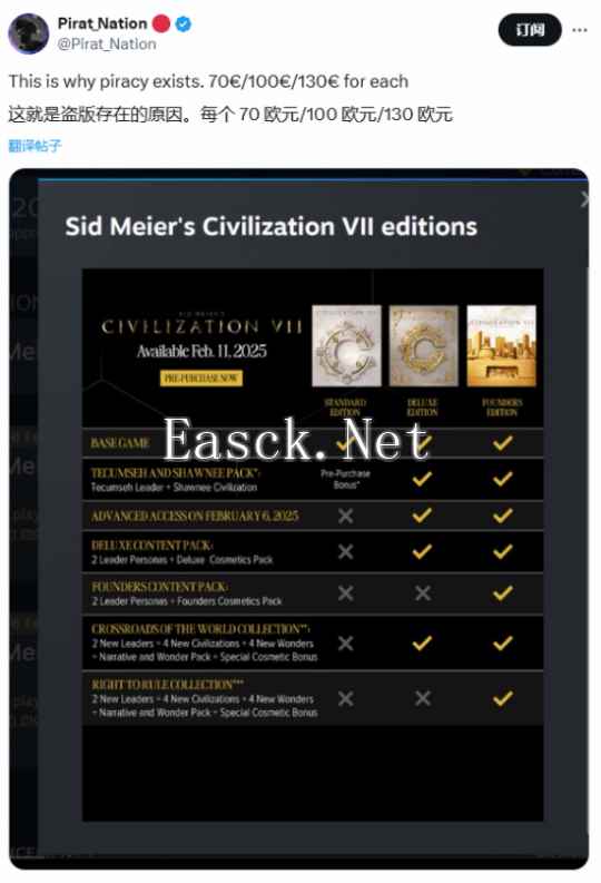 但连日来,《文明7》的游戏价格却引发了一些争议。外网博主Pirat_Nation在X上发布动态,晒出了《文明7》Steam各版本包含的定价,并吐槽:“这就是盗版存在的原因,三个版本分别为70欧元、100欧元与130欧元。”这条动态,引发了玩家们的广泛讨论。